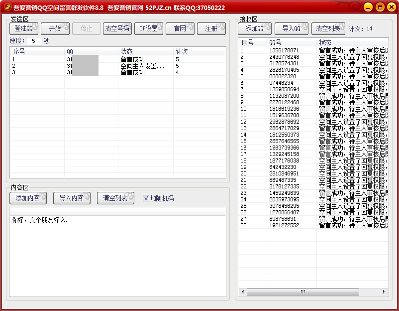 一款自动批量自动发送QQ空间留言的软件,软件支持批量登录QQ小号批量导入目标号码,可添加多条内容轮流发送。