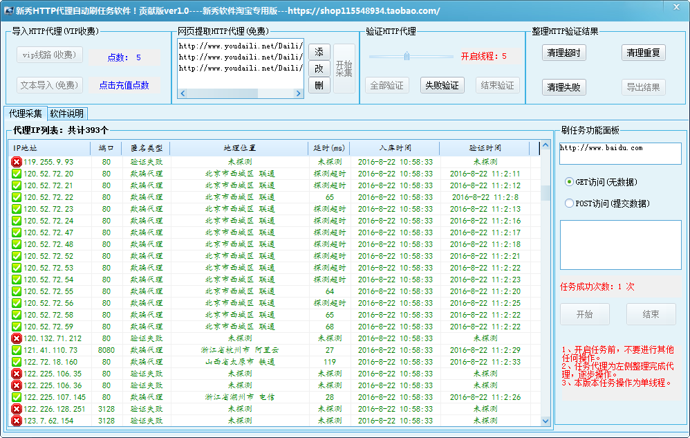 新秀HTTP代理IP验证自动任务软件,本软件可快速提升指定网页IP访问浏览数可快速验证所提取有效代理IP,支持验证IP文本导入、支持文本导出等。