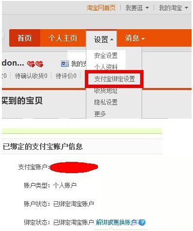 1)这时,在新出现的页面中选择:设置——支付宝绑定设置。如下图。认真填写上面的信息,确认后,你的淘宝号就绑定支付宝了。如下面的第二张图片。